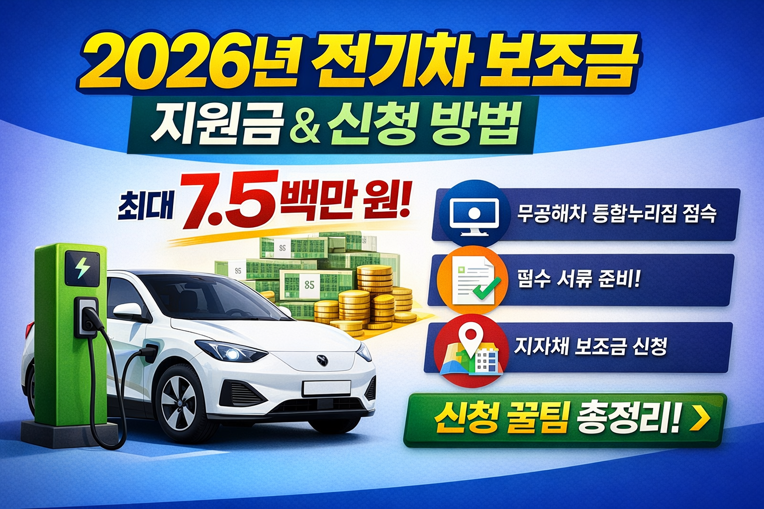 2026년 전기차 지원금은 구조만 이해하면 복잡하지 않습니다. 무공해차 통합누리집 → 지자체 공고 확인 → 대리점 신청 이 3단계만 기억하면 됩니다.